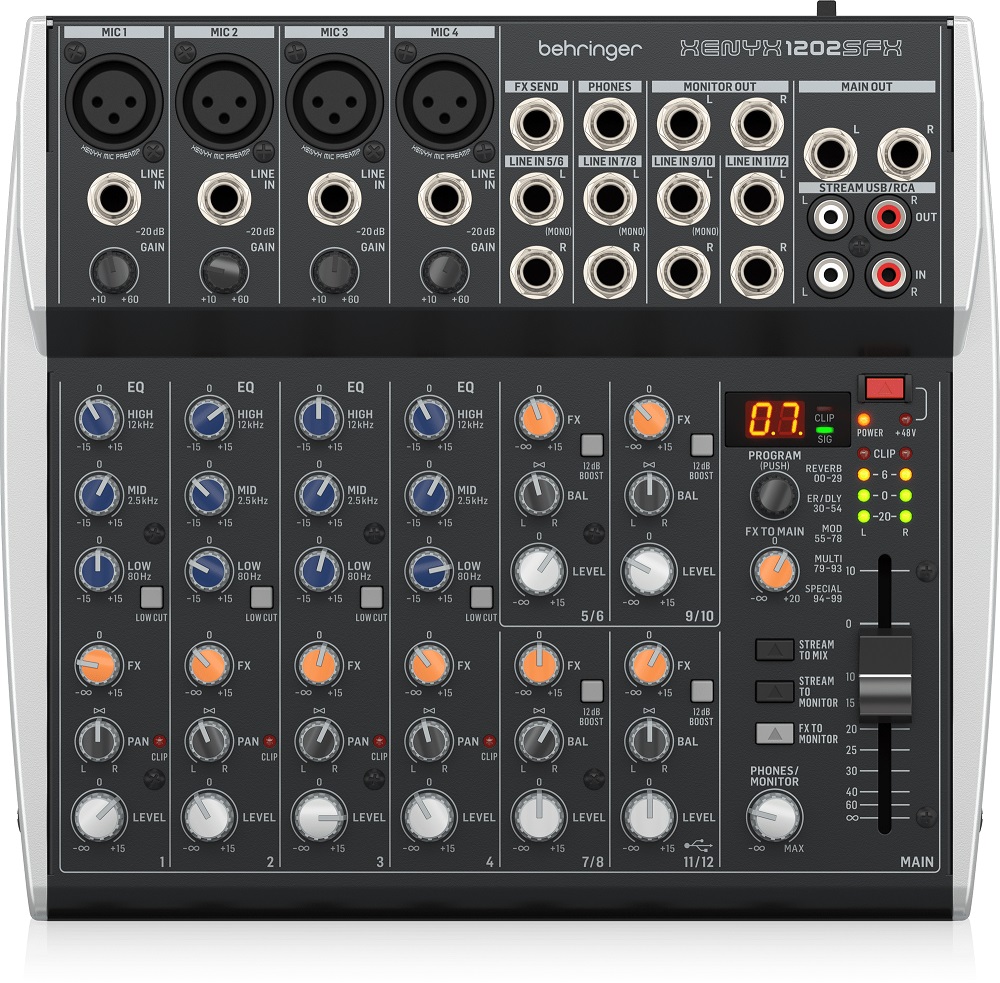 Аналоговий мікшер XENYX 1002SFX має 10 входів, що дають змогу без зусиль домогтися звуку найвищої якості, ідеального для потокового мовлення, подкастингу та живих виступів. Він забезпечує тепле і ультрамузичне звучання завдяки відзначеним нагородами мікрофонним передпідсилювачам XENYX з фантомним живленням 48 В для підключення навіть студійних мікрофонів класу hi-end. Технічні характеристики: 10-канальний мікшер з інтерфейсом USB Для потокового мовлення, подкастів і студійного запису 2 мікрофонні входи XLR з мікрофонними передпідсилювачами XENYX (1 і 2) 2 монофонічні лінійні входи: 6,3 мм небалансний джек (1 і 2) 3 Стерео лінійні входи: 6,3 мм небалансний джек (3/4, 5/6, 7/8) 1 Стереофонічний лінійний вхід: балансний джек 6,3 мм (9/10) 2 Входи і виходи для треків зі стереофонічним аудіоінтерфейсом USB Стерео вихід для навушників: 6,3 мм Стерео входи RCA Моніторний вихід: 6,3 мм небалансний роз'єм Процесор Klark Teknik FX 3-смугові еквалайзери Управління посилом FX на канал Розміри (Ш x Г x В): 272 x 317 x 122 мм Вага: 2,7 кг