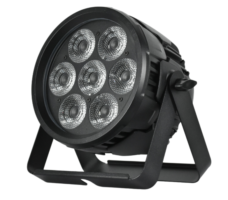 Світлодіодний прожектор. 7 світлодіодів по 20 Вт RGBWA+UV 6-в-1. Лінійний колорчейнджер. Ступінь захисту IP66. 6/10 каналів DMX, режими DMX512/ведучий-ведений/авто/звукова активація.