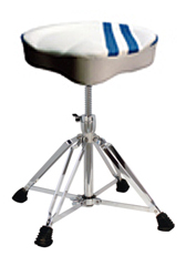 Стільчик барабанщика, чотири подвійні ноги, гвинтове регулювання висоти, велике біле сидіння велосипедного типу c синьою вставкою.