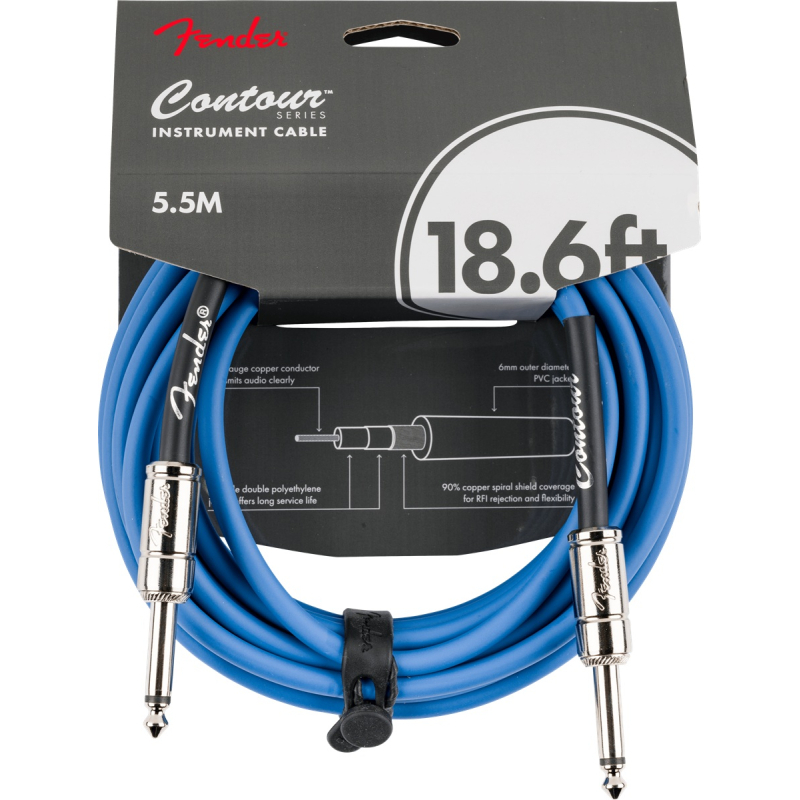 Fender Cable Contour Series 18.6' Lake Placid Blue: Високоякісний інструментальний кабель з бездоганною якістю передачі сигналу. Провідник 24 калібру для підвищеної потужності сигнального шляху. Дротова оболонка зовнішнім діаметром 6 мм для низького рівня шумових перешкод. Спіральне екранування із 90% безкисневої міді для кришталево чистого звуку. Нікельовані роз'єми забезпечують довговічність. Довжина – 5.5 м. Колір – синій.