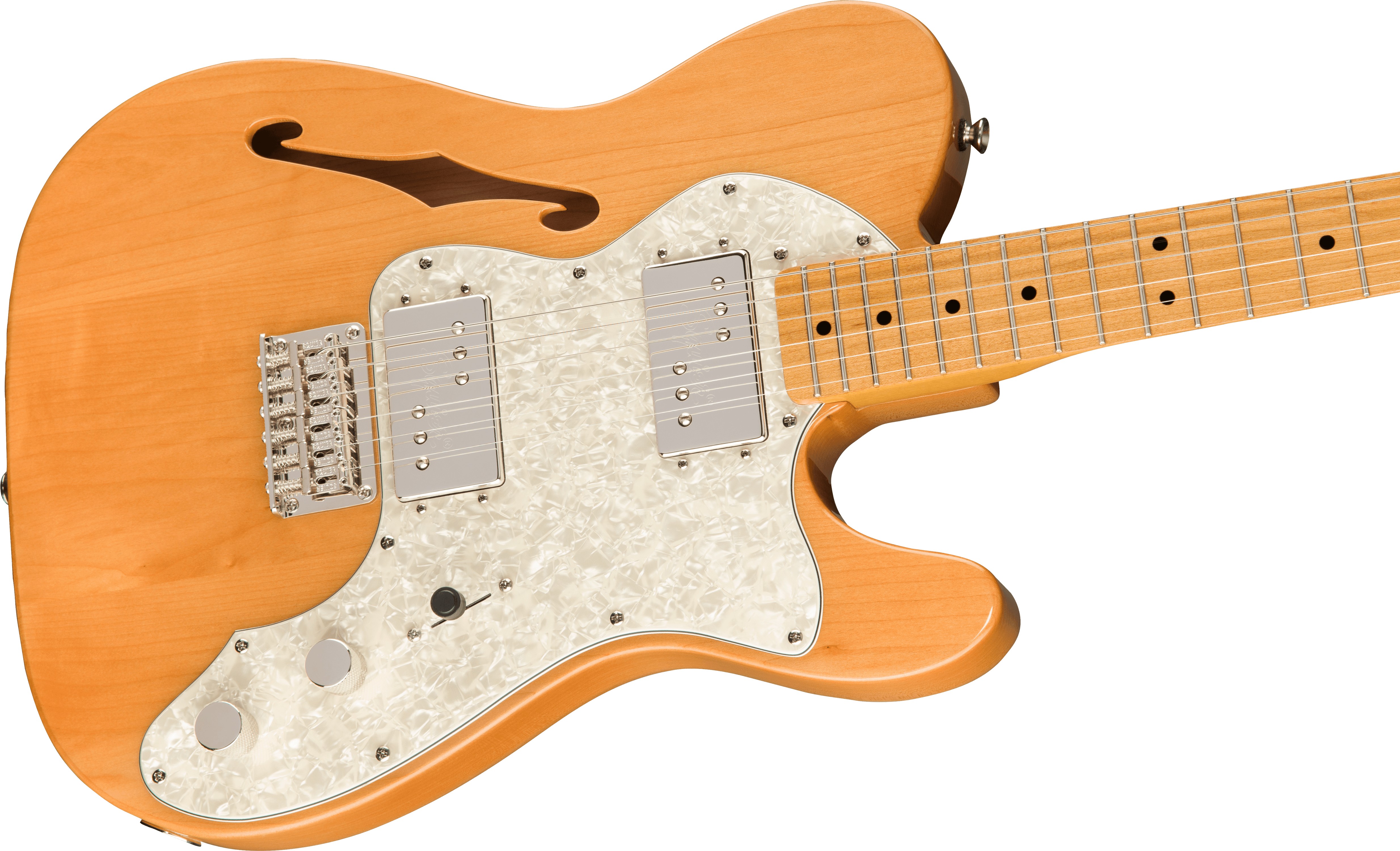ender Designed Wide Range хумбакери, встановлені в мостовій та грифовій позиціях, забезпечують широкий динамічний діапазон: від яскравих, дзвінких чистих тонів до насиченого, теплового хуму при більшому рівні гучності. Тонкий «C»-подібний гриф із обсмаженого клена та 9,5-дюймовим радіусом накладки сприяє природному хвату та легкому виконанню акордів і сольних пасажів. Narrow-tall лади допомагають точно інтонувати ноти і зручні для бендів. Телекастерівський hardtail-бридж з натягом струн крізь корпус і шістьма індивідуальними сідлами зберігає струнний натяг рівномірним і стабільним. Вінтажні колки та нікельована фурнітура закріплюють олдскульний образ інструмента. Завдяки легкості корпусу та збалансованому розподілу ваги гітара зручно лежить як у сидячому, так і у стоячому положенні. Natural-фініш випускає на показ красу натурального клена, підкреслюючи текстуру деревини.