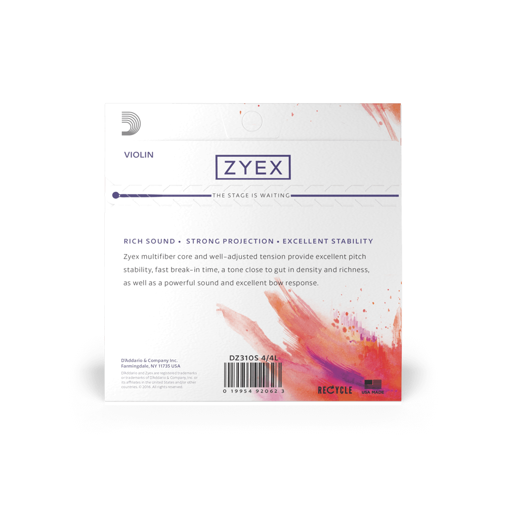 Протягом декількох годин скрипкові струни Zyex дають усадку, створюючи більш теплий звук, ніж у інших струн з синтетичним осердям.