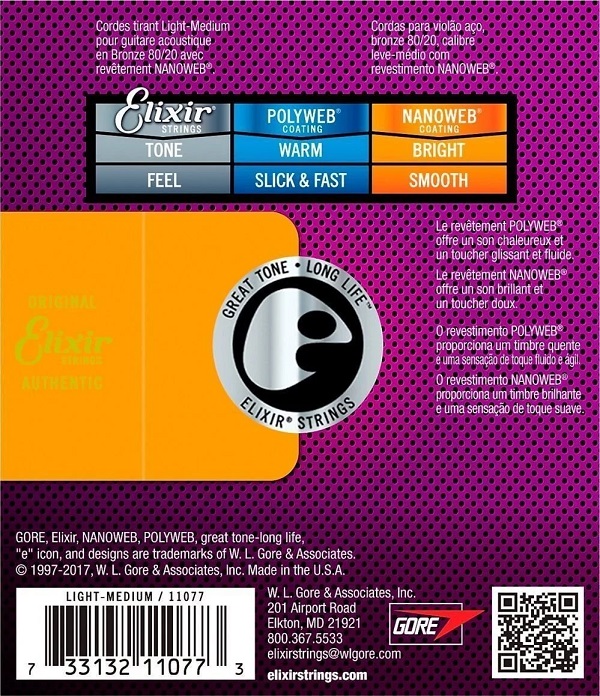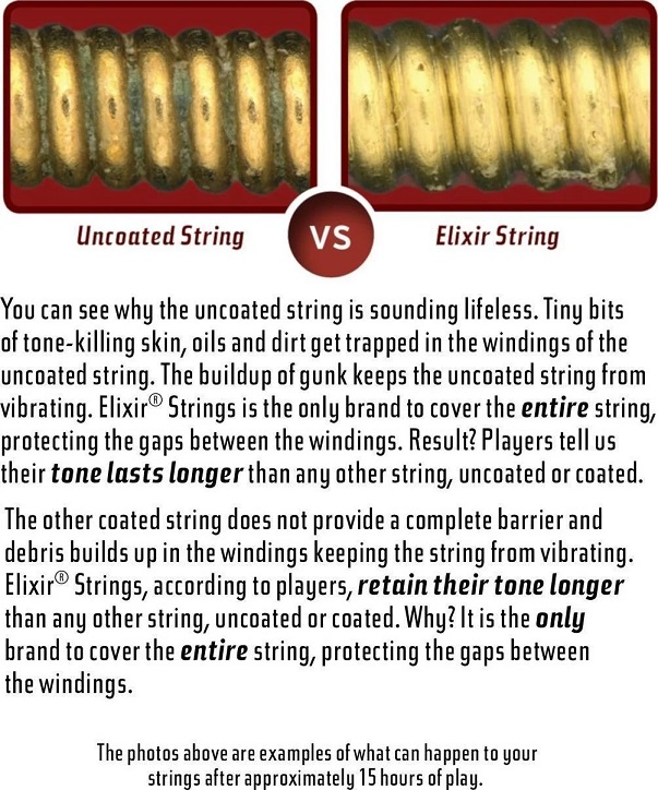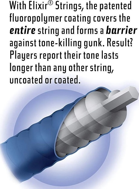 Струни Elixir виробляються за унікальною технологією, за якої обмотка захищається спеціальним шаром Nanoweb або Polyweb. Цей шар заповнює простір між витками обмотки і допускає попадання туди сторонніх частинок, збільшуючи термін служби струн більш як втричі. Інноваційне покриття не стирається від гри і від тертя обладнання і ніяк не впливає на якість звучання - струни Elixir звучать так само яскраво і дзвінко, як і струни без обмотки. Крім цього, вони дуже збалансовані по всій довжині і мають тривалий сустейн, що говорить про високу якість виробництва.