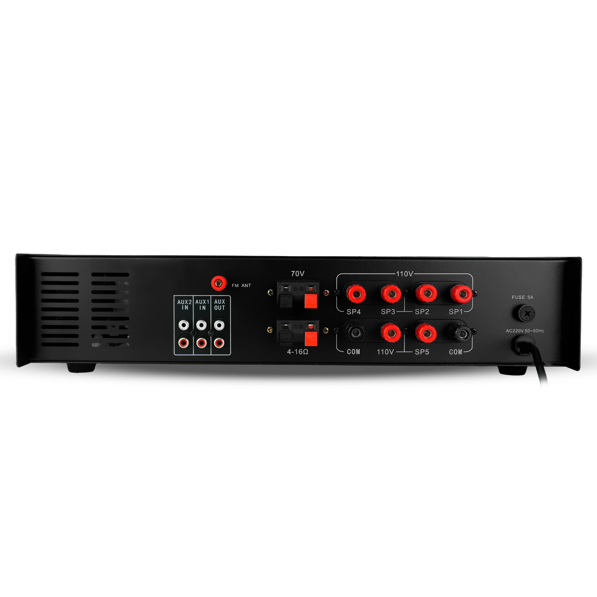• Виходи 70В/100В (5 зон), 70В/100В (загальний), 4-16 Ом, AUX (RCA)