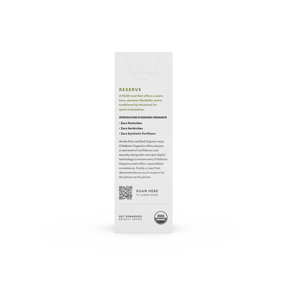 Представляємо нову еру тростин для саксофона! Завдяки відданості музикантам та турботі о планеті, органічні тростини D'Addario пропонують неперевершену гру без хімікатів, пестицидів або синтетичних добрив. Від поля до фінальної обробки, вони відповідають стандартам сертифікації органічної продукції Міністерства сільського господарства США, зберігаючи при цьому їхнє французьке коріння.