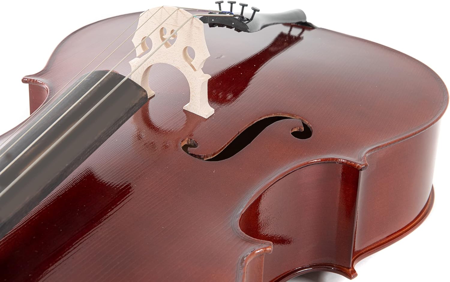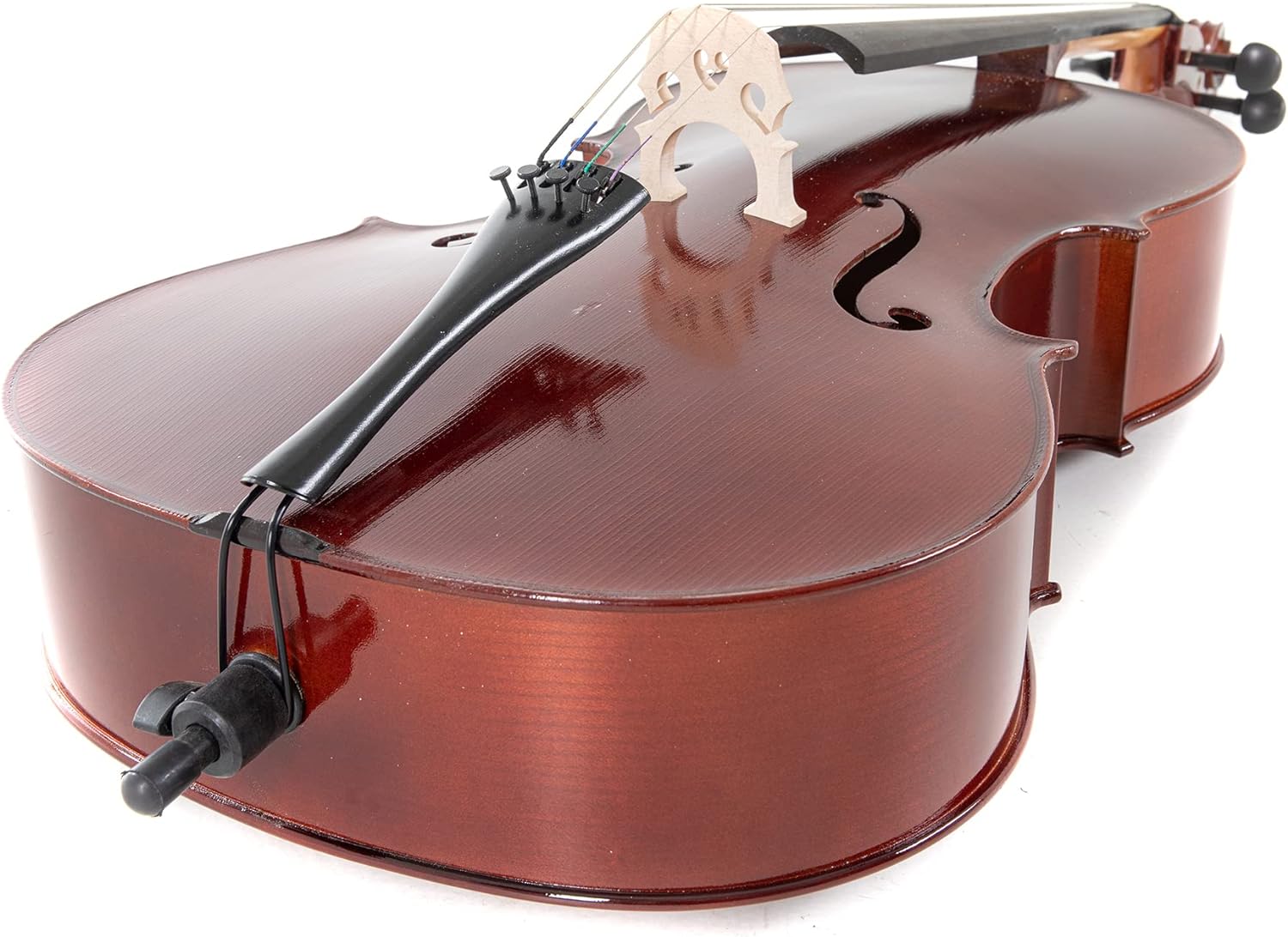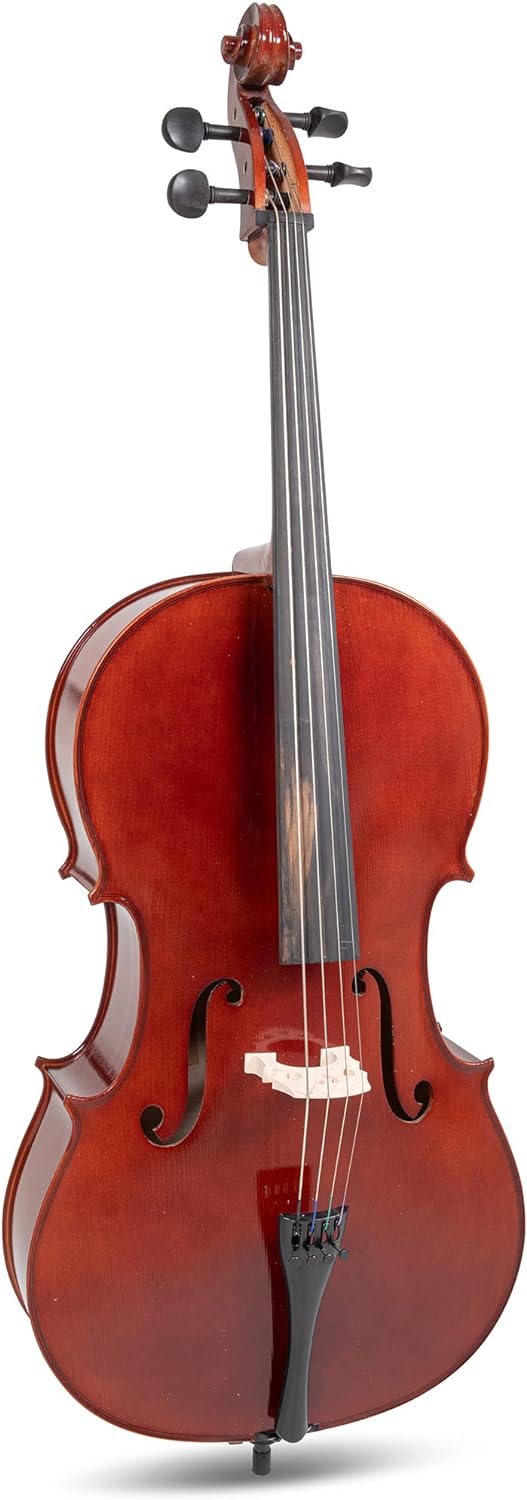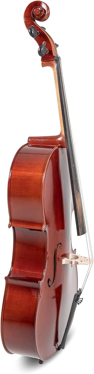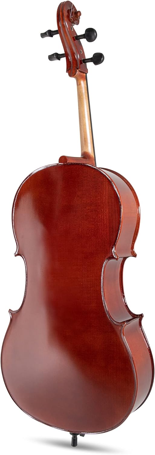 Верхня дека виготовлена з цільної ялини (solid spruce), що забезпечує чітке і яскраве звучання, а нижня дека та обичайки зроблені з цільного клена (solid maple), що додає теплоту і глибину звуку. Така комбінація деревини є традиційною для струнних інструментів. На віолончелі є в ставна інкрустація - елемент, що допомагає захистити інструмент від пошкоджень і додає естетичної привабливості інструменту. Кілки, накладка на гриф, підборідник. Фурнітура виготовлена з твердого дерева. Використання твердої деревини для накладки грифа, кілків та інших деталей забезпечує довговічність і стійкість до зношування. Корпус покритий лаком темно-коричневого кольору .Лакування не лише додає елегантного зовнішнього вигляду, але й захищає деревину, дозволяючи їй вільно вібрувати, що впливає на якість звуку. На струнотримачі встановлена мікропідстройка для кожної струни, що робить налаштування інструменту зручним. Зручно для точної настройки інструменту, особливо для учнів і початківців. Шпиль має кріплення з чорного дерева - це не лише естетична деталь, але й надійний елемент для стійкості під час гри.
